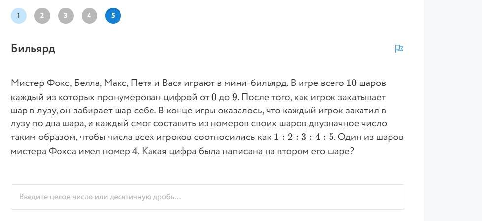 Мистер Фокс, Белла, Макс, Петя и Вася играют в мини-бильярд. В игре всего шаров каждый из которых пронумерован цифрой от до . После того, как игрок закатывает шар в лузу, он забирает шар себе. В конце игры оказалось, что каждый игрок закатил в