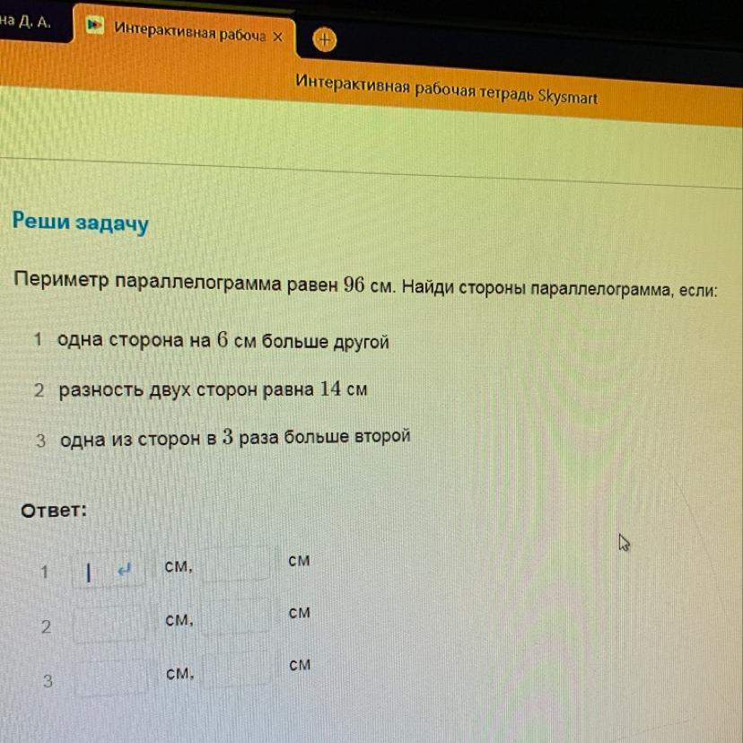 Периметр параллелограмма равен 96 см. Найди стороны параллелограмма, если: