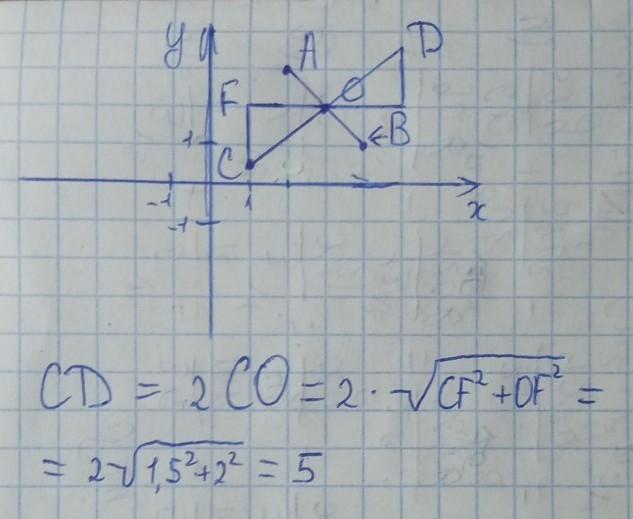 можно нарисовать все это на плоскости (с координатами)... можно решить только по координатам... координаты точки О -это координаты середины отрезка АВ: О(6/2; 4/2) или О(3; 2)... расстояние CD = 2*CO... координаты вектораСО {3-1; 2-0.5} или {2; 1.5} расстояние СО = длине вектораСО = V(4+2.25) = 2.5 ОТВЕТ: 2*2.5=5