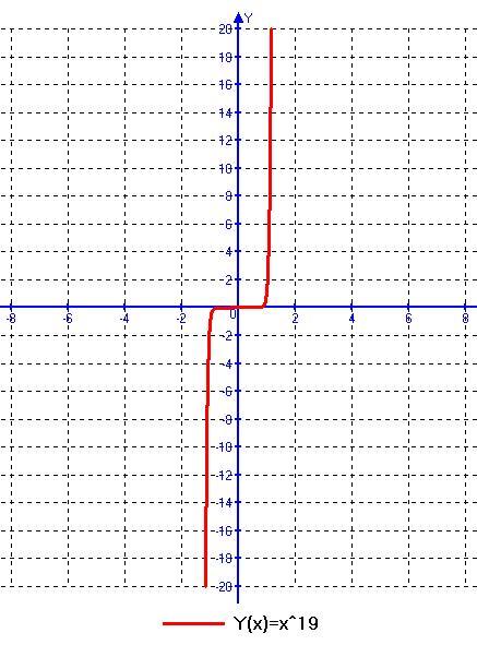 поскольку x в 19 степени это произведение x самого на себя 19 раз, то конечный результат функции будет иметь знак зависящий от значения x. при x положительном и значение f будет положительным, при x отрицательном и результат будет отрицательным (потому что 19 нечетное число). Тогда график этой функции будет раcполагаться в I и III четвертях. См рисунок.