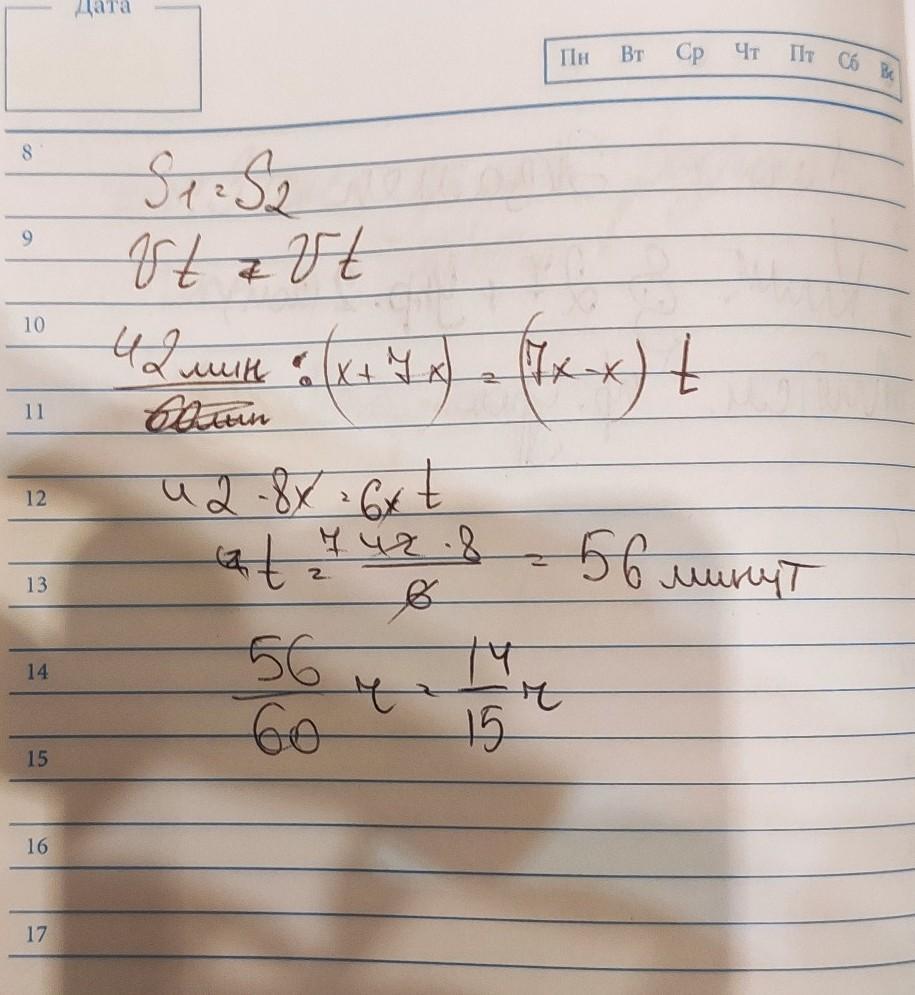 примем х за скорость течения , значит скорость катера 7х, значит по течению общая скорость 8х,а против 6х. Приравниваем и получаем 56 минут