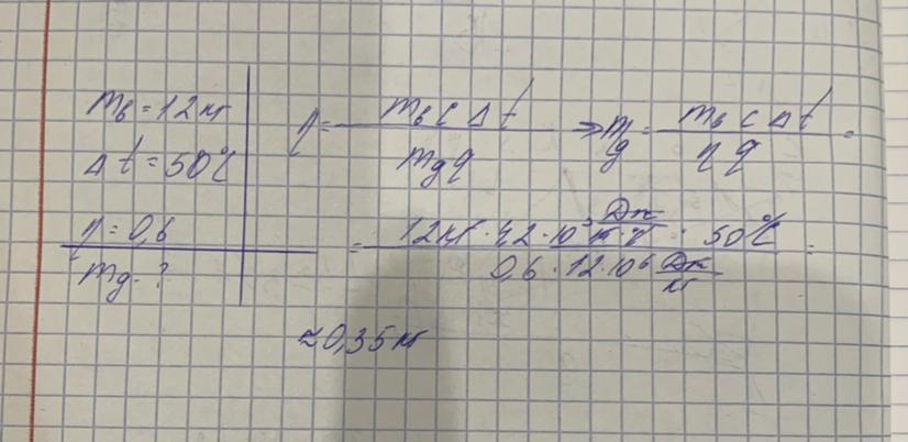Определите массу дров,сгоревших в печи для нагревания воды массой 12 кг на 50°С ,если потери энергии составили 60%