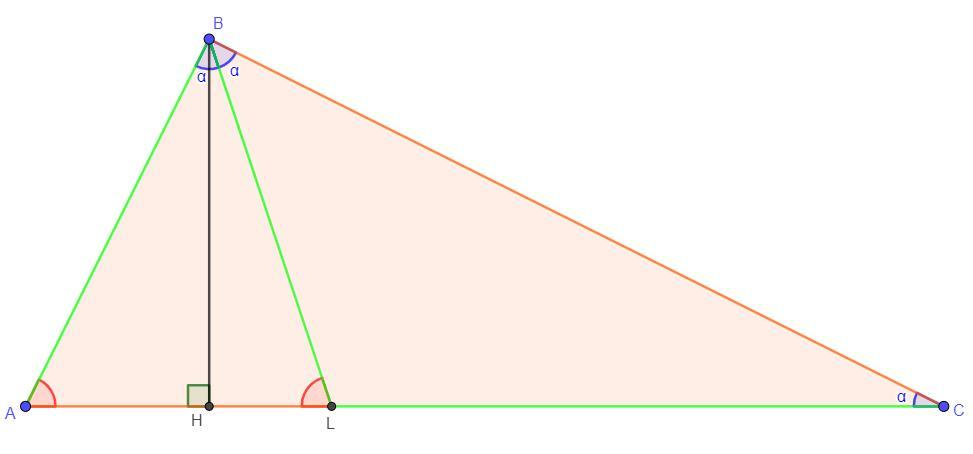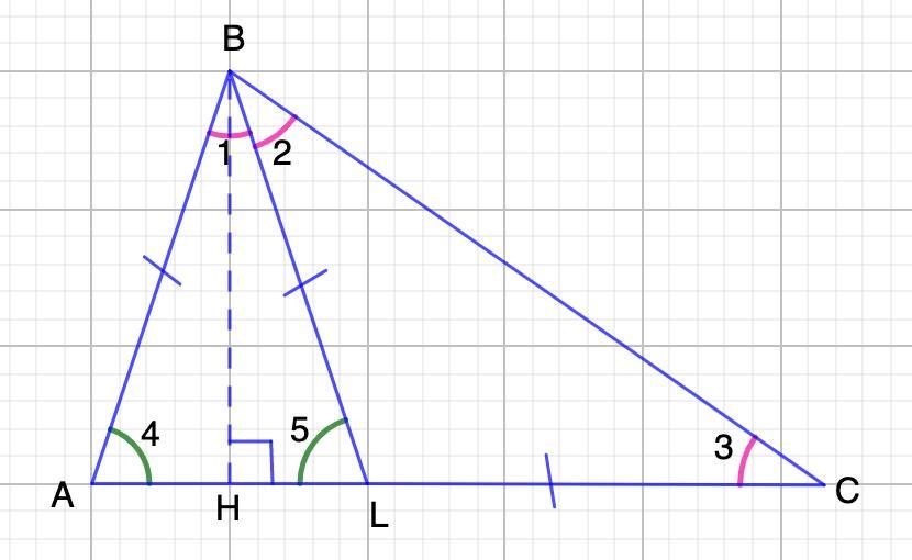 В треугольнике ABC провели высоту BH и биссектрису BL. Оказалось что треугольник ABL и LBC равнобедренные, а BH высота равнобедренного треугольника ABL, проведённая к основанию AL. Докажите что треугольник ABC равнобедренный