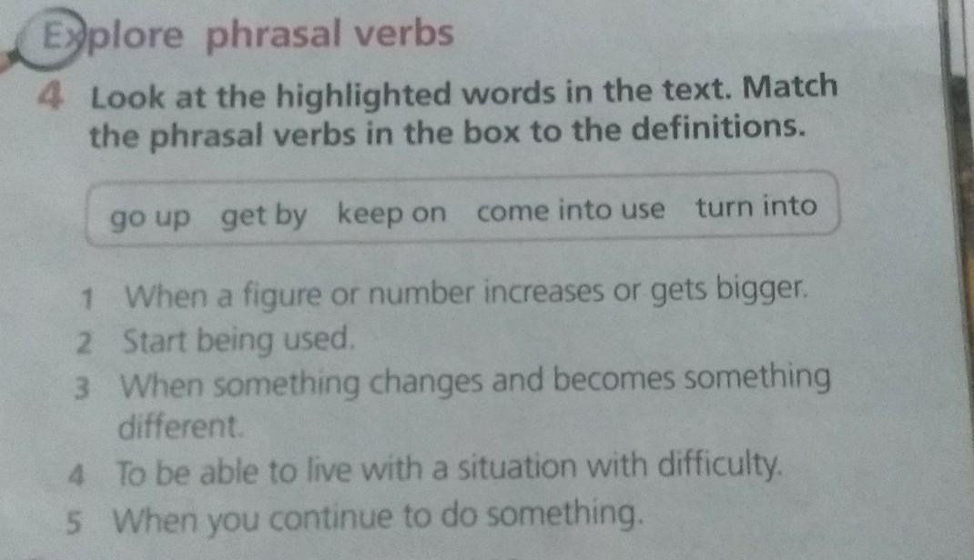 look at the highlighted words in the text.Match the phrasal verbs in the box to the definitions