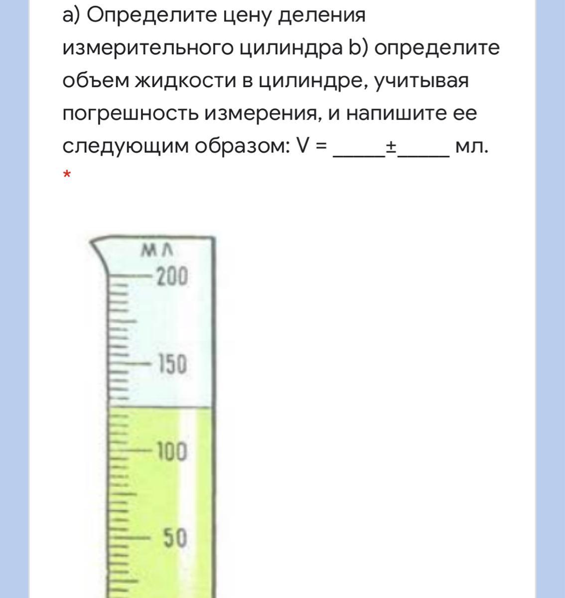 а) Определите цену деления измерительного цилиндра b) определите объем жидкости в цилиндре, учитывая погрешность измерения, и напишите ее следующим образом: V = _____±_____ мл. *