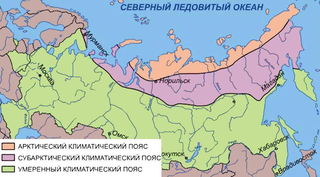 Россия из-за своей огромной территории расположена в нескольких климатических поясах.С севера на юг они расположены в следующей последовательности.