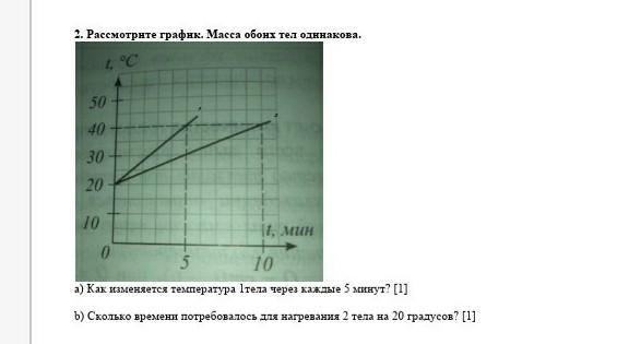a) Как изменяется температура 1тела через каждые 5 минут? [1]
