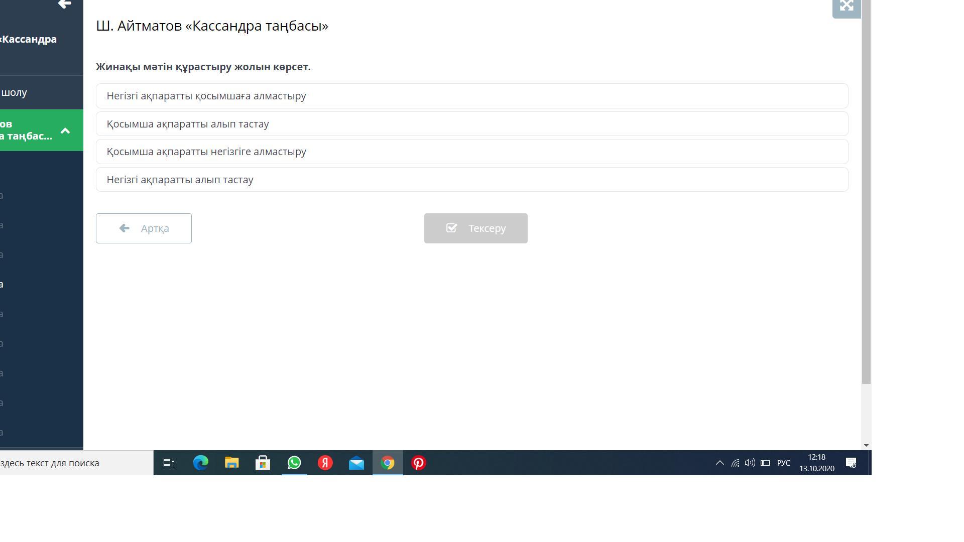 Ш. Айтматов «Кассандра таңбасы» Жинақы мәтін құрастыру жолын көрсет. Негізгі ақпаратты қосымшаға алмастыру Қосымша ақпаратты алып тастау Қосымша ақпаратты негізгіге алмастыру Негізгі ақпаратты алып тастау