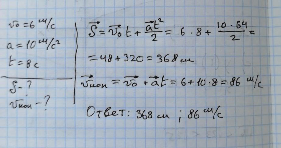Тело движется с начальной скоростью 6 м/с и ускорением 10 м/с2. Определите скорость и перемещение тела через 8 секунд.