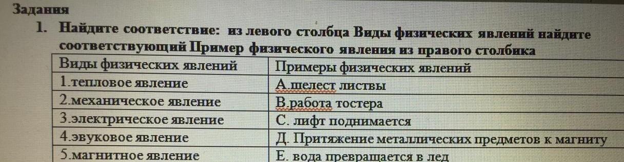 Найдите соответствие из левого столбца виды физических явлений соответствующий пример физического явления из правого столбика