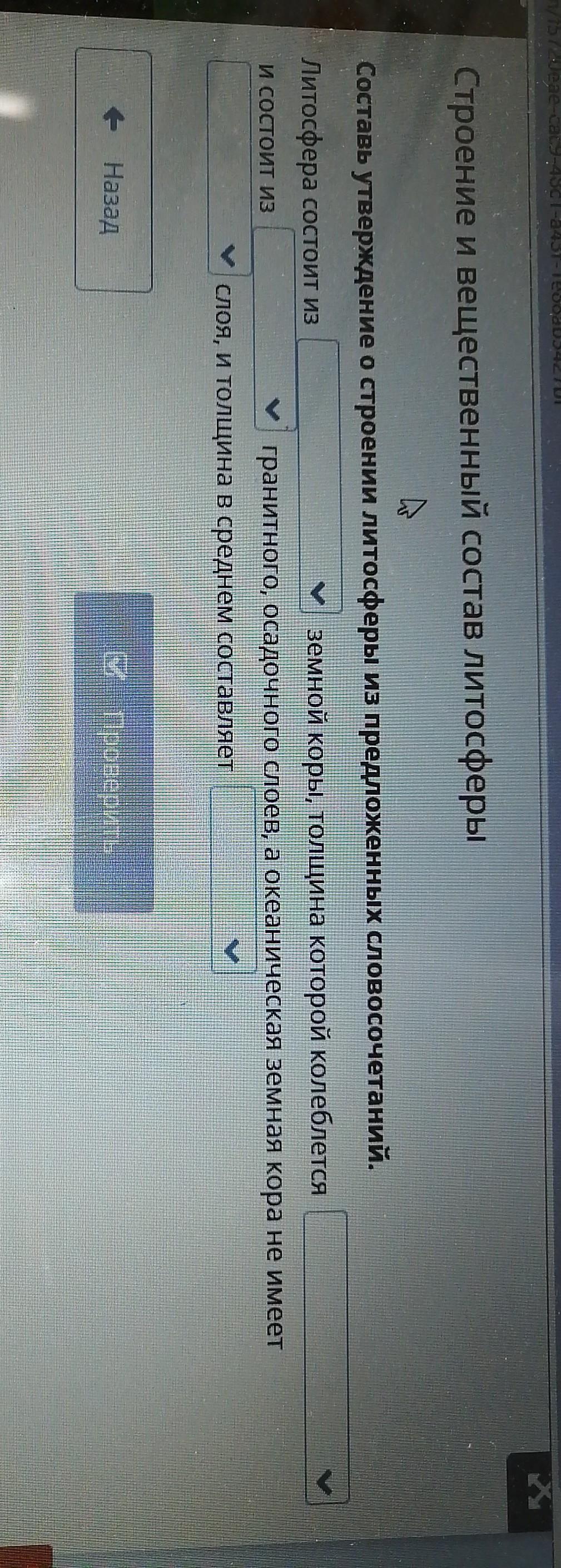 Составьте утверждения строение литосферы из предложенных словосочетания литосфера состоит из земной коры толщина которой колеблется и стоит из гранитного осадочного слоев и океаническая земная кора не имеет слой и толщина в среднем составляет