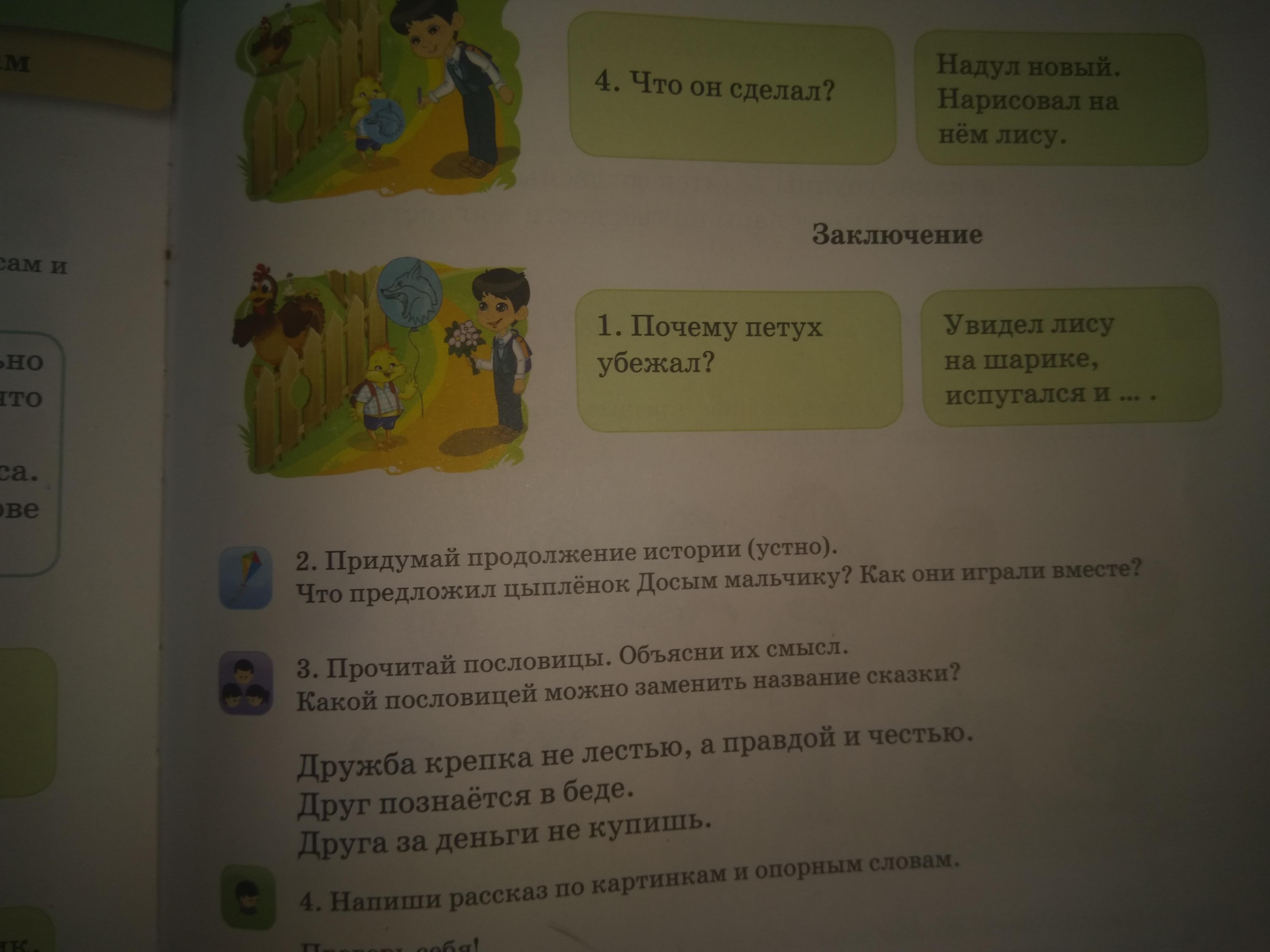 мальчик надул цыпленку новый шарик , и нарисовал на нем лису , петух увидел лису и убежал