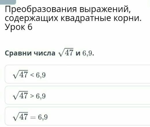 Объяснение:√47<6.9, т.к. у=√х- возрастающая функция при всех допустимых значениях х.