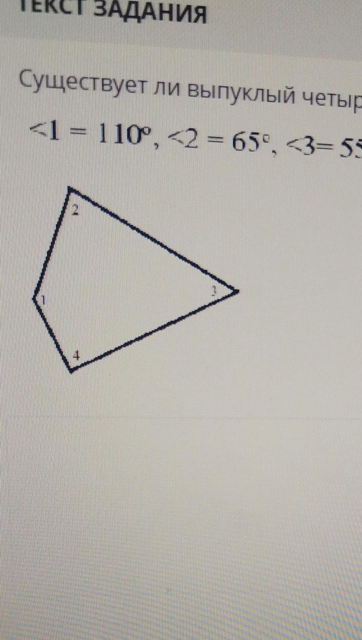 Существует ли выпуклый четырехугольник углы которого равны 110° 65° 55° 130°?