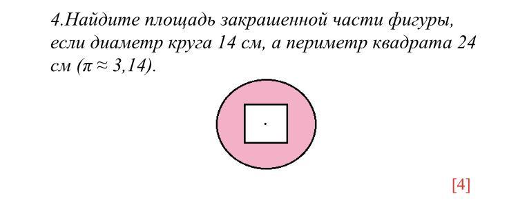 Найдите площадь закрашенной части фигуры, если диаметр круга 14 см, а периметр квадрата 24 см (π ≈ 3,14).