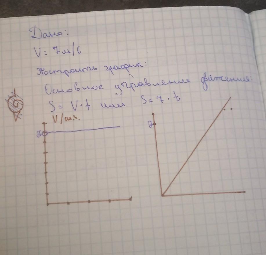 Постройте графики зависимости скорости и пройденного пути от времени для тела движущегося со скоростью 7м/с