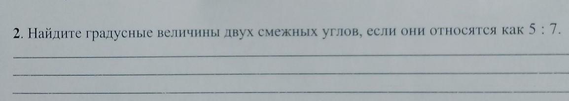 2. Найдите градусные величины двух смежных углов, если они относятся как 5 : 7. геометрия