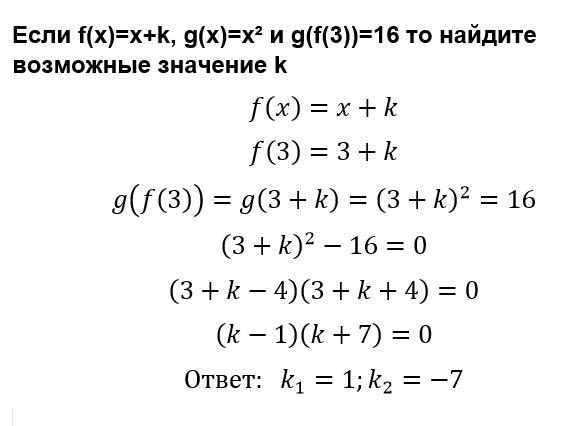 если f(x)=x+k, g(x)=x² и g(f(3))=16 то найдите возможные значение "k"