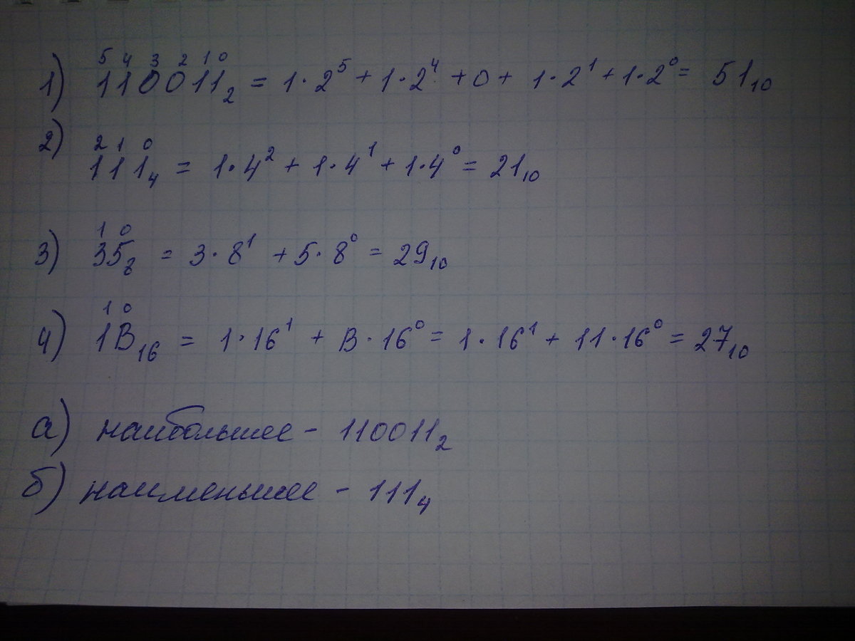 1. Какое из чисел 110011во 2-ой, 111 в4-ой , 35в 8-ой и 1В в16-ой является: a) наибольшим; b) наименьшим.
