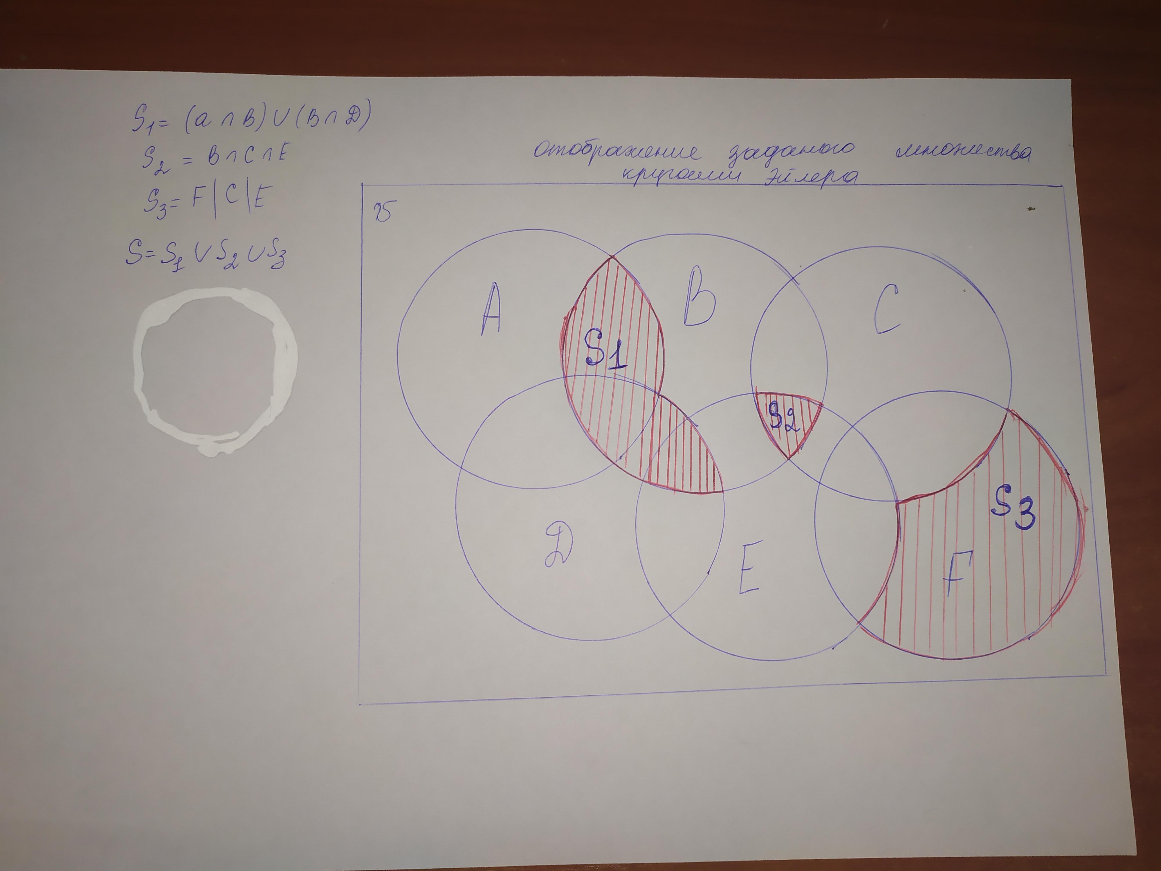 универсумом U — точки прямоугольника. С помощью теоретикомножественных операций описать элементы множеств, принадлежащие заштрихованным областям S1, S2, S3 и общей заштрихованной области S. 2. Отобразить заданное множество с помощью кругов Эйлера.