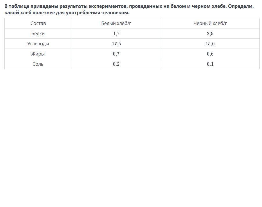 В таблице приведены результаты экспериментов, проведенных на белом и черном хлебе. Определи, какой хлеб полезнее для употребления человеком.