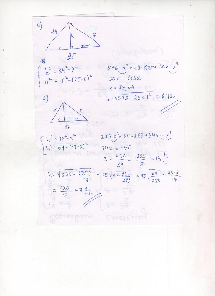 Найдите меньшую высоту треугольника со сторонами, равными а) 24 см. , 25 см, 7 см. б) 15 см. 17 см, 8 см