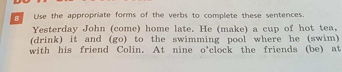 Yesterday John came home late. He made a cup of hot tea, drank it and went to the swimming pool where he swam with his friend Colin. At nine o'clock the friends were at...