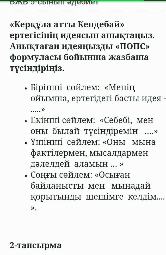 Керқұла атты Кендебай» ертегісінің идеясын анықтаңыз. Анықтаған идеяңызды «ПОПС» формуласы бойынша жазбаша түсіндіріңіз.