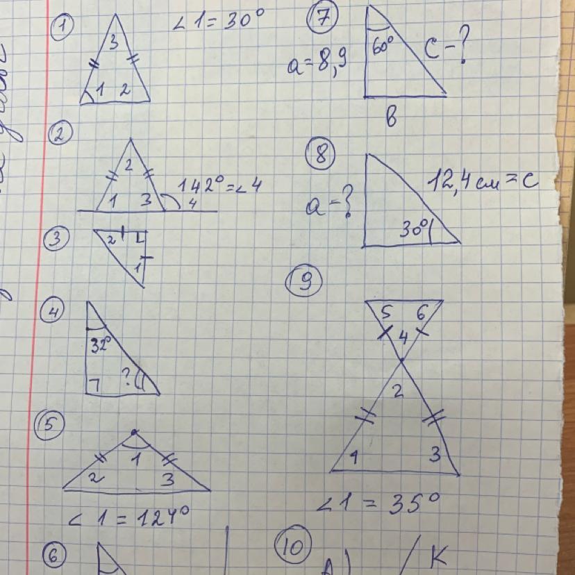 9. Угол 1 = углу 3 = 35. Угол 2 равен 180 - (35 + 35) = 110 градусов. Угол 2 = углу 4 = 110 (как вертикальные). 180 - угол 4 = 70. Делим на 2 так как треугольник равнобедренный = 70 : 2 = 35 градусов угол 5 и 6