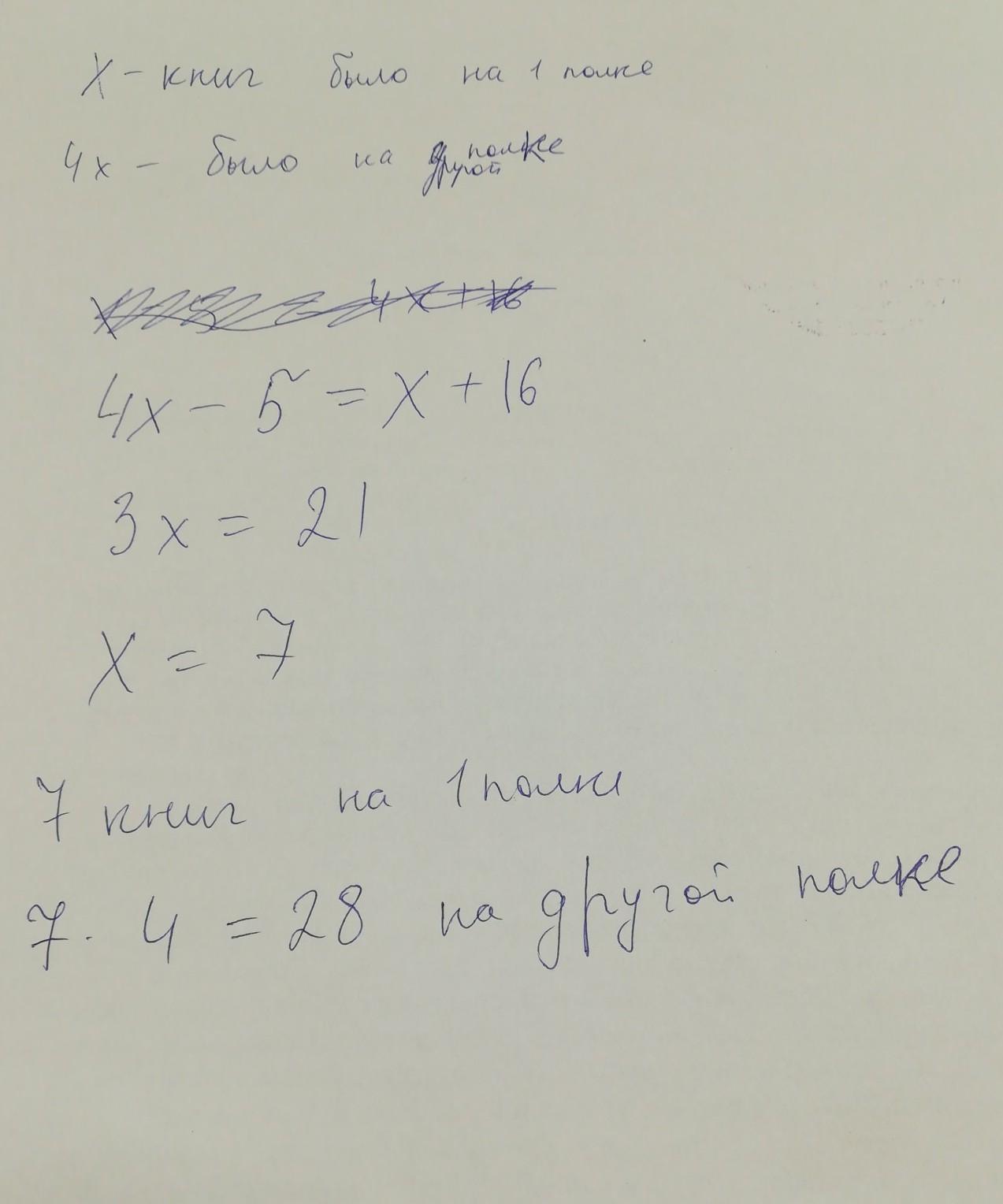 9. Решите задачу, составив уравнение. На одной полке было в 4 раза больше книг, чем на другой. Когда с первой полки взяли 5