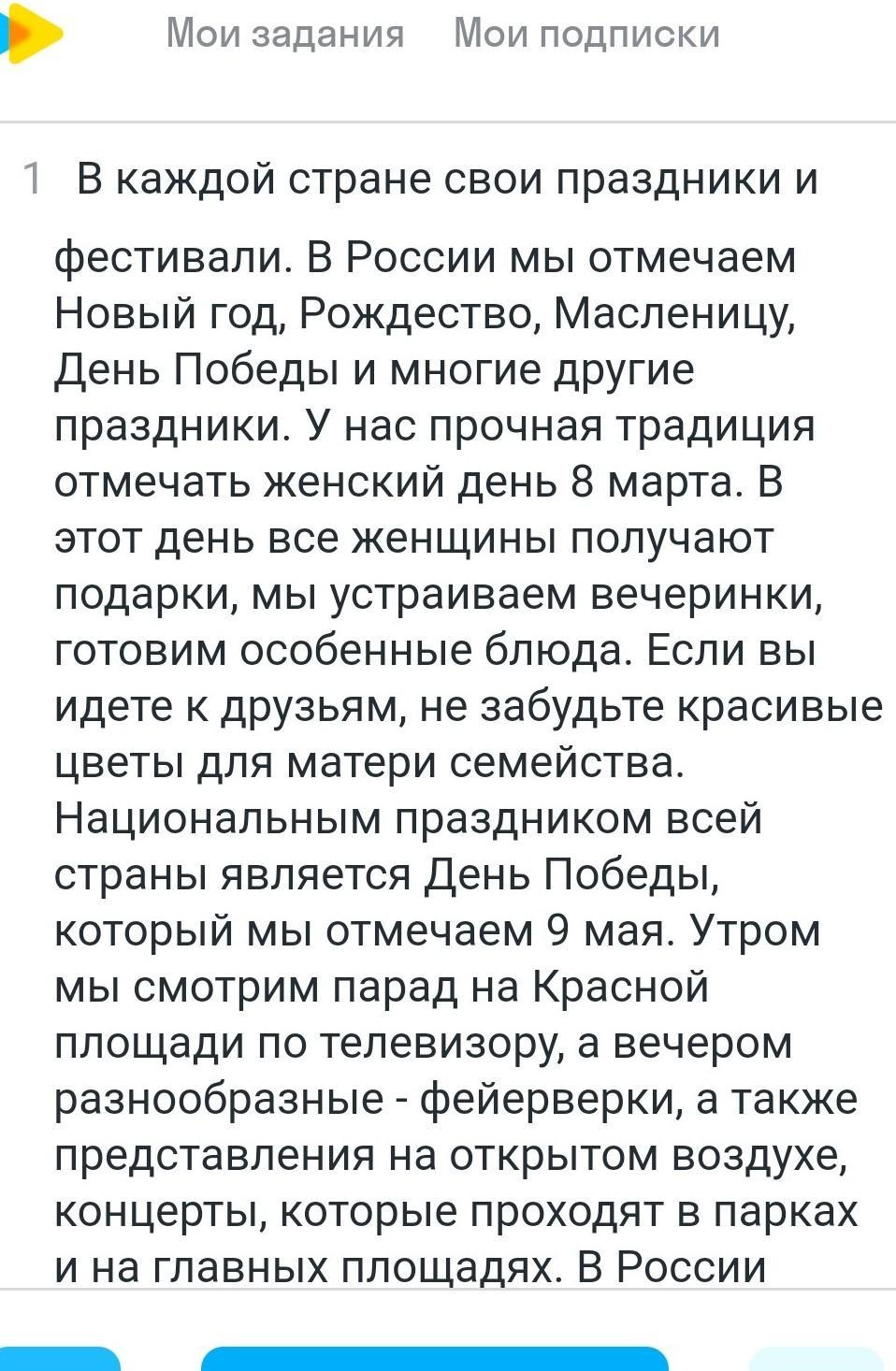 B kaxAoň CrpaHe CBON npa3AHNKU U şectMBann. B Poccun Mbl OTMEYAEM HOBBIÉ roA, POXĄECTBO, MacNEHNUY, AeHb No6ebl N MHOrne Apyrne npa3AHNKN. Y Hac rpo4HaA Tpaänyna OTMEYATB XEHCKNÉ AEHB 8 Mapra. B ƏTOT AEHB Bce xEHUNHbl нонялот ногапку, Mbl yCtpanBaeM BEYEPNHKN, FOTOBUM OCo6eHHble 61o4a. Ecnn BbI MAETE K APY3BAM, HE 3a6yAbTE KpachBble 4BETBI AMA MaTepn cemeňCTBa. HaynoHanbHbIM npa34HNKOM BCeé CTpaHbl ABAAETCA AEHB No6eäbl, KOTOPBIM MbI OTMEYAEM 9 Maa. YTpoM Mbl CMOTPUM napaą Ha KpacHoé NJOwagn no TEIEBN30PY, a BEYEPOM pa3Ho06pa3Hble - žežepBepKn, a TaKxe npeActaBnEHNA Ha OTKPBITOM BO3AYXE, KOHBB NOHLE B Поккун