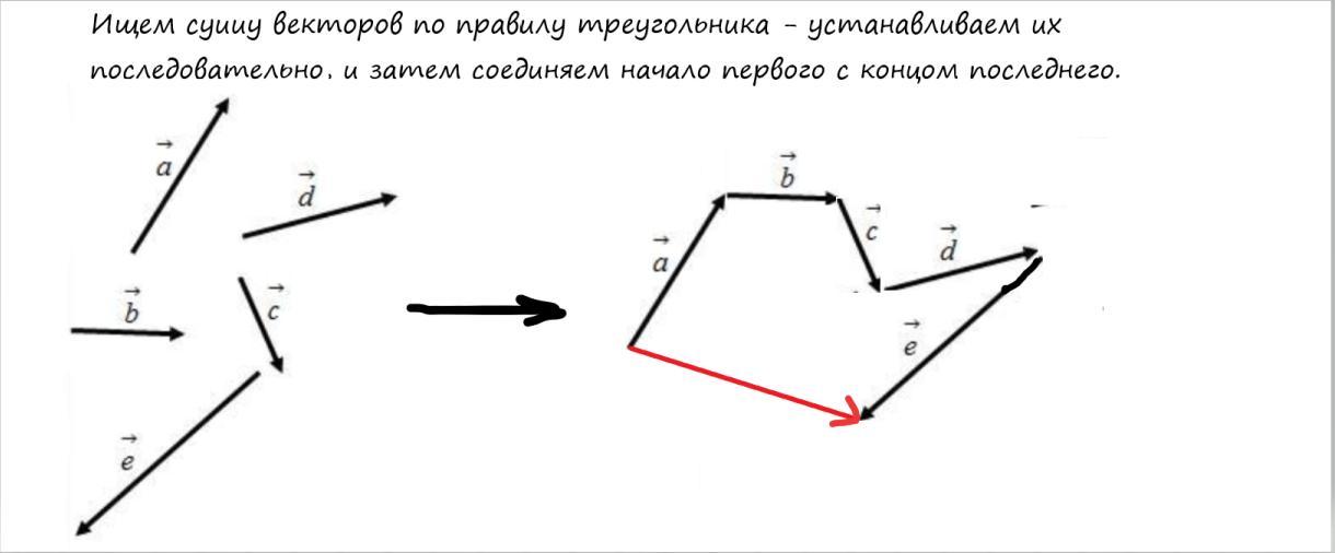 Есть 2 основных правила сложения векторов - правило треугольника - когда каждый вектор располагается за каждым и правило параллелограмма - когда мы 2 вектора, выходящие из одной точки, дополняем до параллелограмма (посмотрите на 2 рисунок, если не понятно)