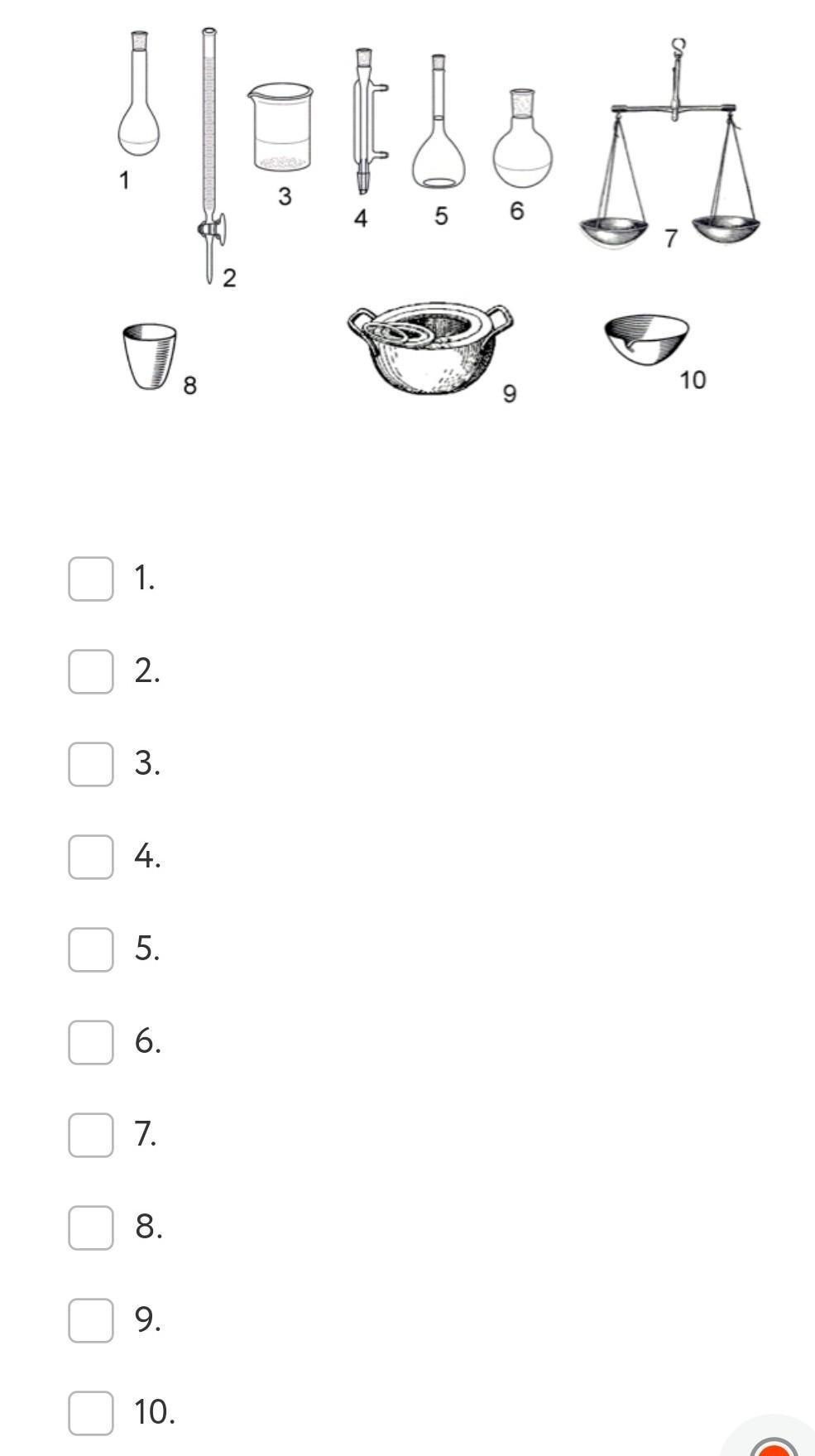 В книге А. Смита «Введение в химию» (Берлин, 1921 г.) приведено описание следующего опыта: «В тщательно взвешенную выпарительную чашку насыпать около 1 гр. (точное взвешивание) двууглекислого натрия и растворить в чистой разбавленной соляной кислоте, которую прибавлять из стаканчика маленькими порциями. Когда двууглекислый натрий растворится, всю жидкость выпарить досуха под тягой на водяной бане. По охлаждении взвесить. Выберите номера, которыми обозначены посуда и оборудование, необходимые для выполнения описанного эксперимента.