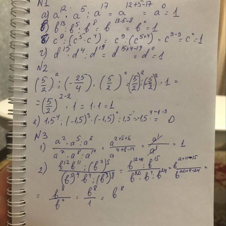 а) а¹² * а⁵ : а¹⁷ = а¹²⁺⁵ : а¹⁷ = а¹⁷ : а¹⁷ = 1;