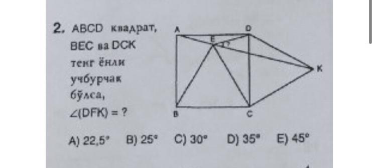 Перевод: ABCD- квадрат, если BEC и DCK равнобедренные треугольники, угол(DFK)=?