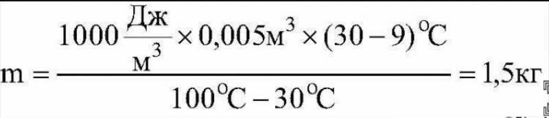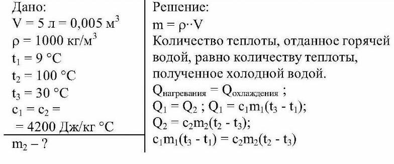в ведро налито 5 л холодной воды, температура которой 9 градусов. сколько кипятка нужно долить в ведро, чтобы получить теплую воду температурой 30 градусов. потерями энергии следует пренебречь