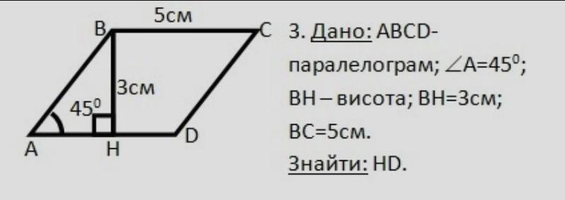АН = BH*ctg 45 = 3см * 1 = 3см