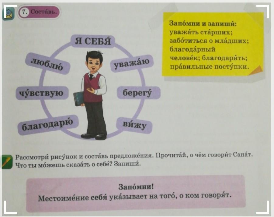 Я люблю себя , я уважаю старших , я благодарный человек , я умею писать на русском , я уважаю старших