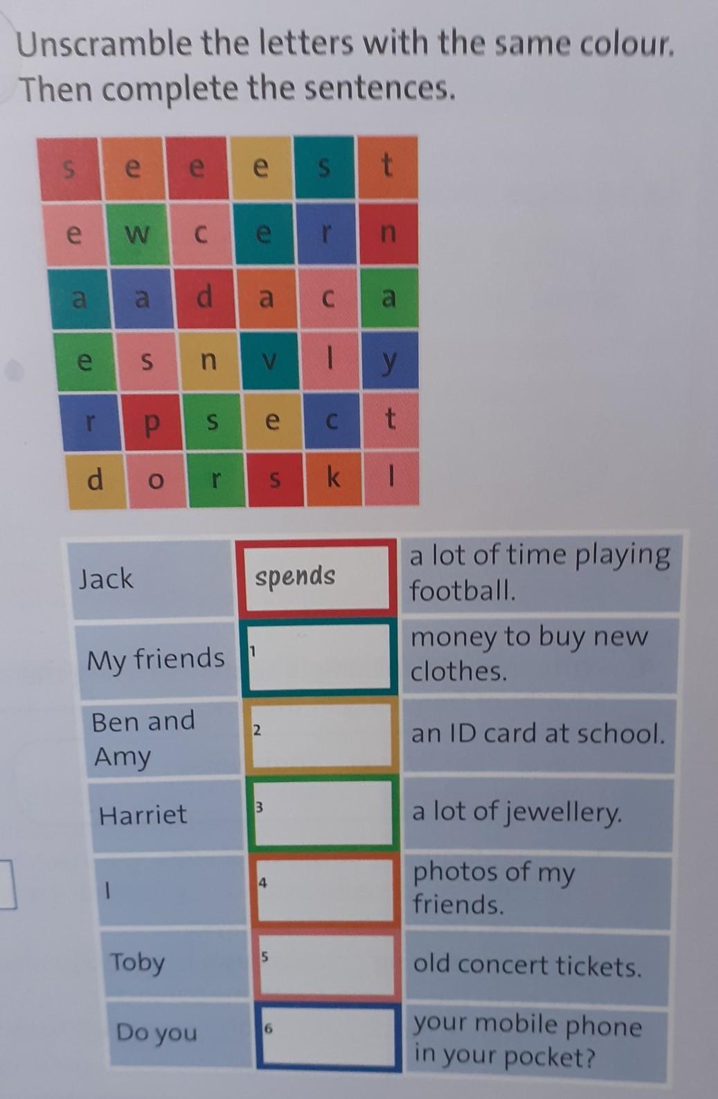 Unsecramble the letters with the same colour Then complete the sentences Помогите пожалуйста даю 100 баллов. СРОЧНО