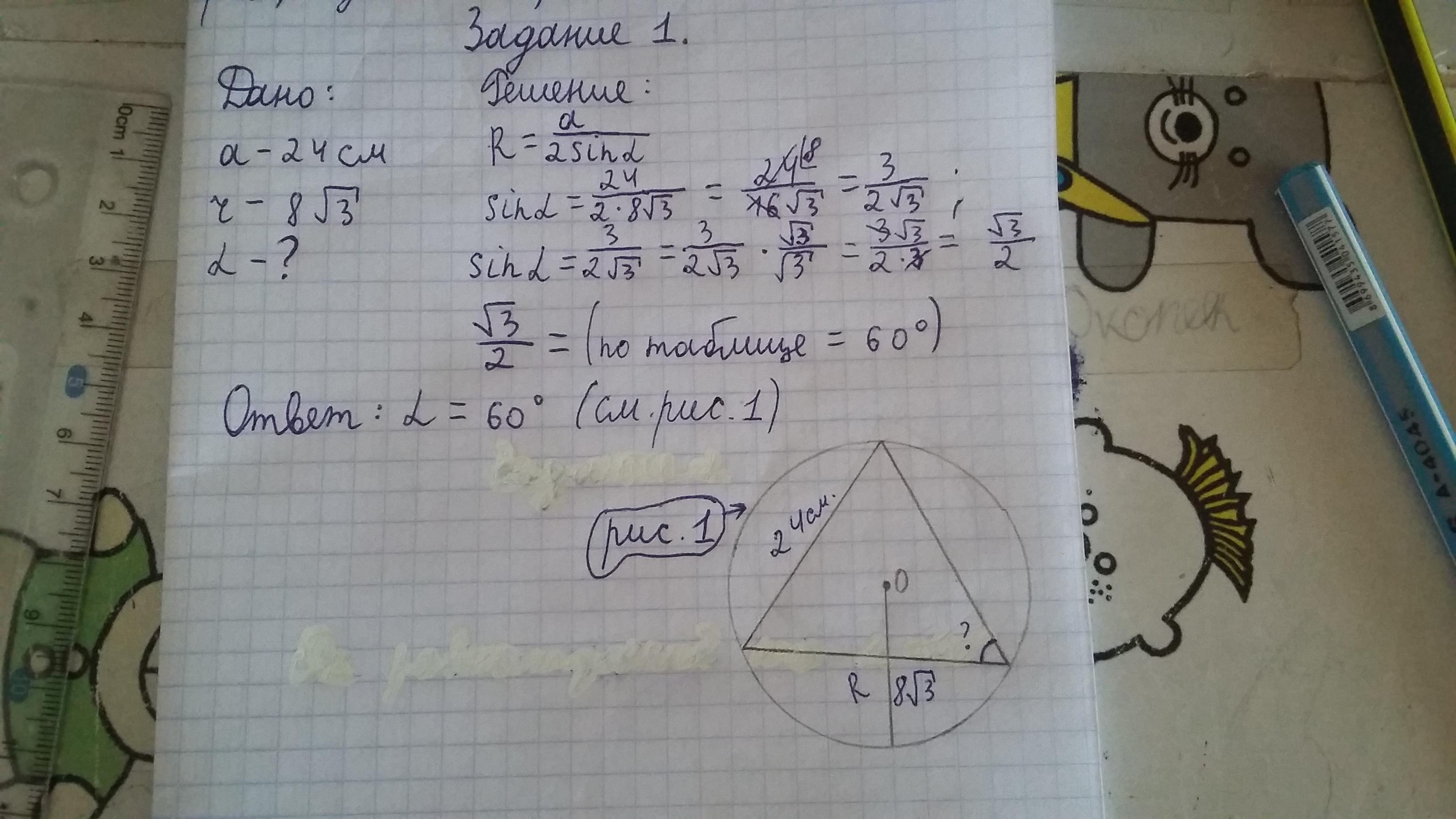 сторона треугольника равна 24 см, а радиус описанной окружности 8√3 см. Чему равен угол треугольника, противолежащий данной стороне?