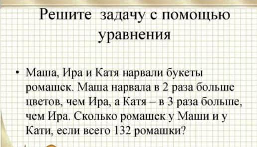 Количество ромашек которые нарвала Ира обозначим х, тогда количество цветов названных Машей равно 2х, а Катей- 3х.