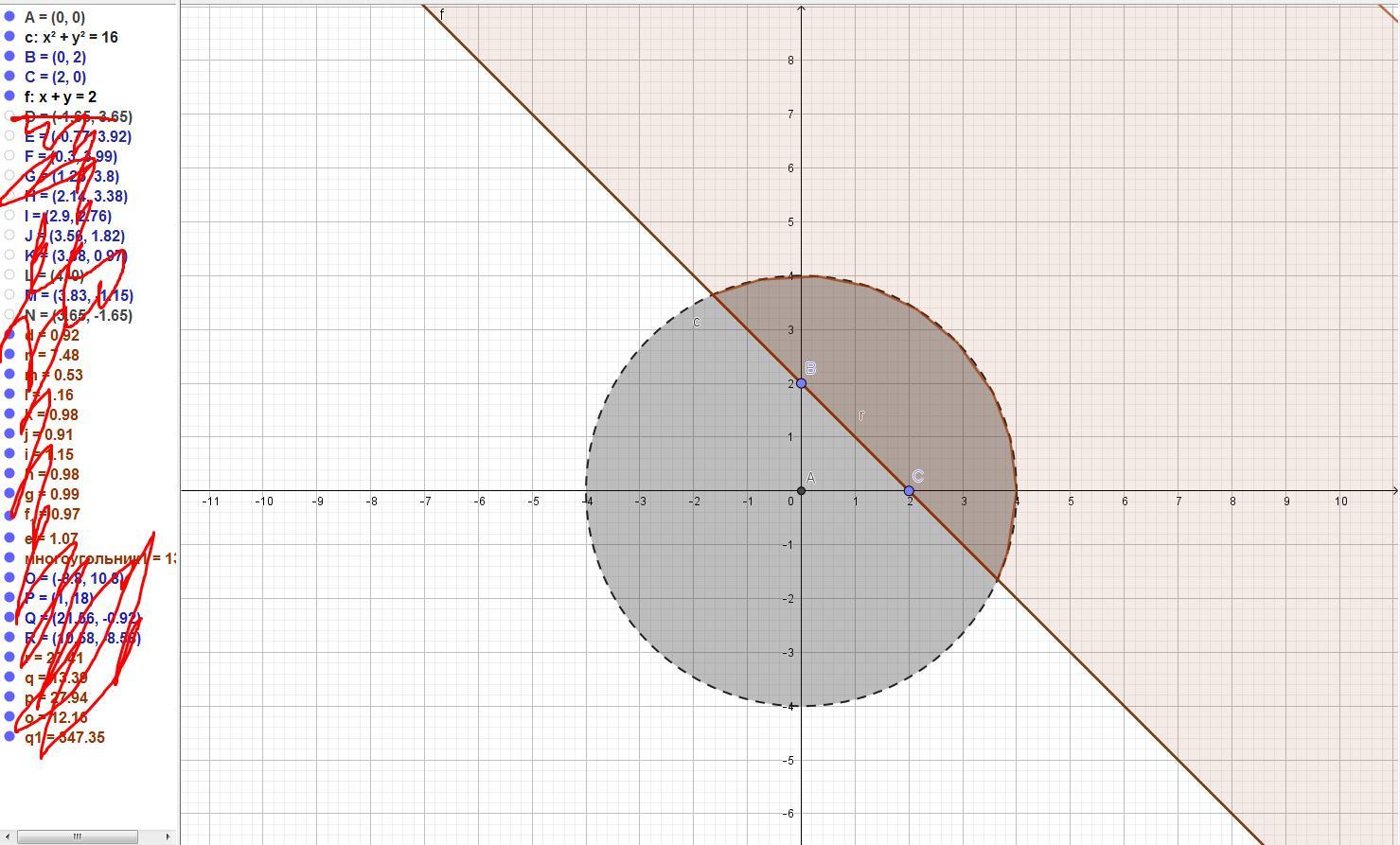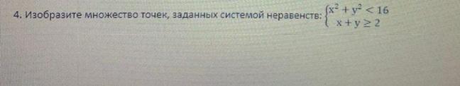 Исходя из первого неравенства получим, что множество точек, нужных нам, находится внутри окружности с центром (0; 0) и радиусом 4. (Обратите внимание, линия самой окружности не входит в данное множество)