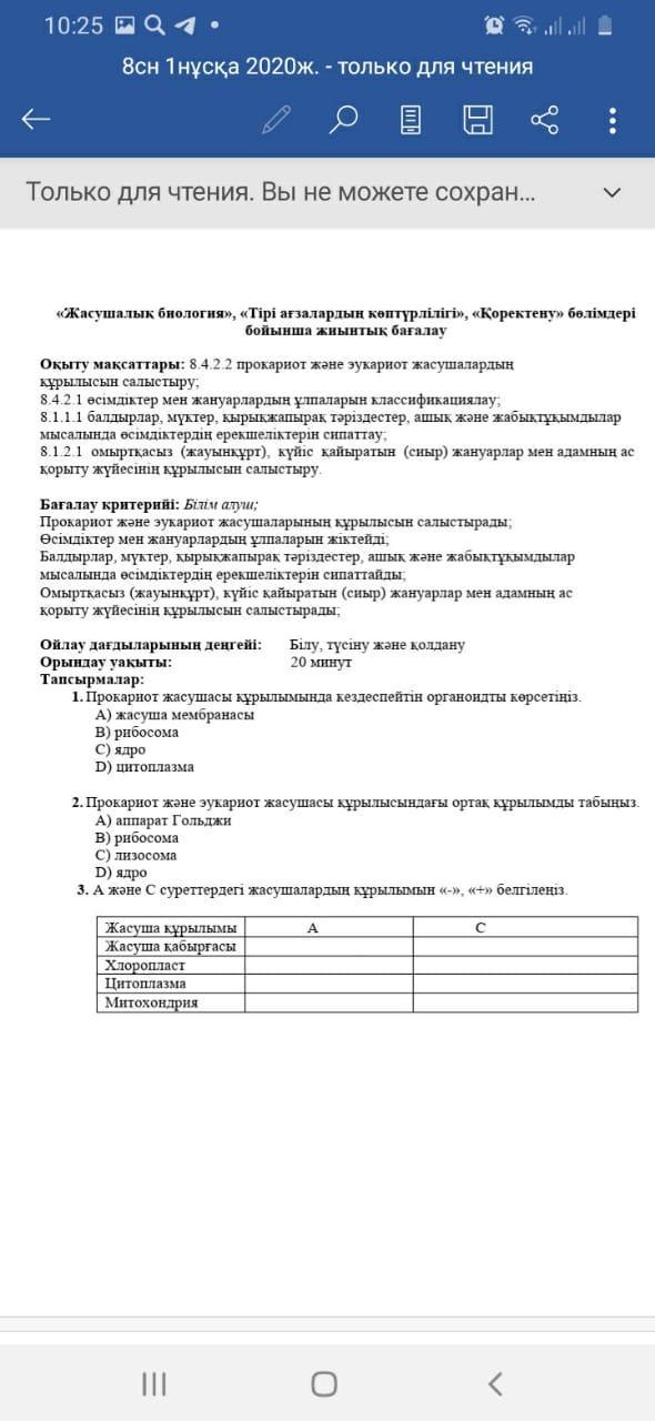 А жене с суреттердегi жасушалардын курылымын "-", "+" белгiлениз жасуша курылымы жасуша кабыргасы хлоропласт цитоплазма митохондрия