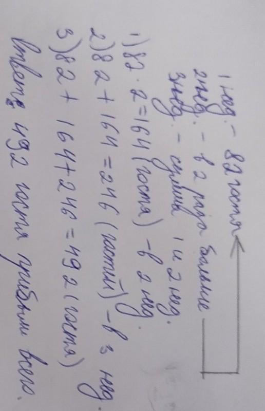 в первую неделю в гостиницу прибыло 82 костя,во вторую неделю прибыло в два раза больше гостей,а в третью неделю прибыло столько же, сколько за первую и вторую неделю вместе. Сколько гостей посетили гостиницу за три недели