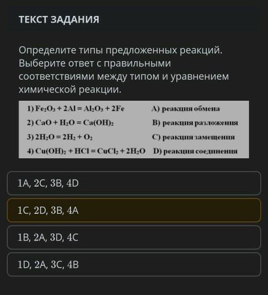выберите тип предложенных реакций.выберите ответ с правильными соответствии между типом и уравнением химической реакции, если что на фото врядли верный ответ выбран, помогите пожалуйста