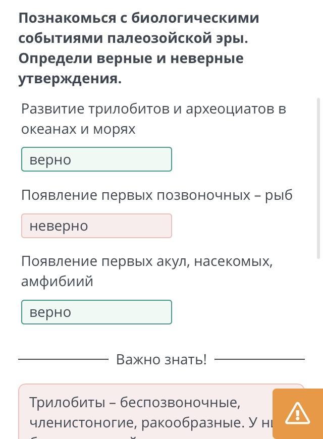 Познакомься с биологическими событиями палеозойской эры. Определи верные и неверные утверждения.
