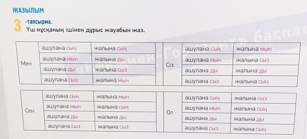 Сен ашуланасың, жалынасың, сіз ашуланасыз, жалынасыз, ол ашуланады, жалынады.