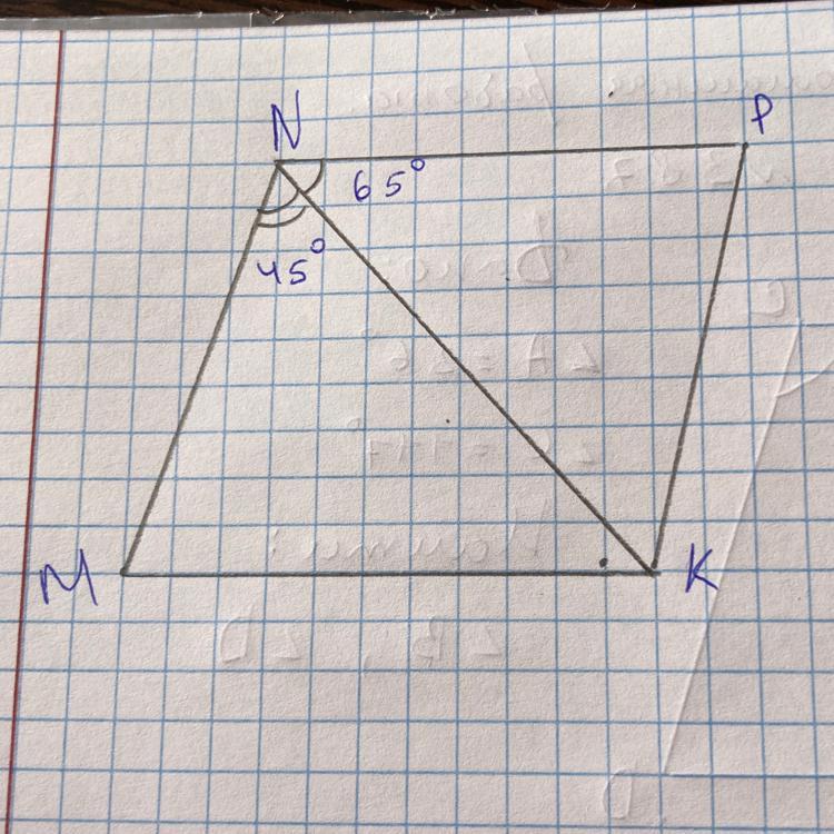 ∠NKM=180-45-70=65° (или в параллелограмме стороны равны и параллельны, поэтому ∠NKM=∠PNK=65° накрест лежащие)