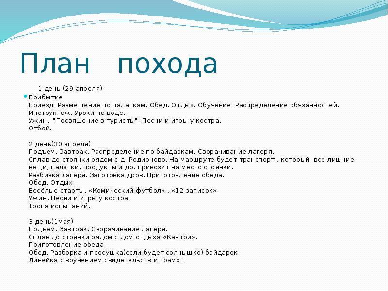 Помогите составить план по "Подготовке к походу" из 4-ех этапов: 1-ый "Организационный этап", 2-ой "Оборудование", 3-ий "Снаряжение, экипировка" и 4-ый "Неприкосновенный запас"