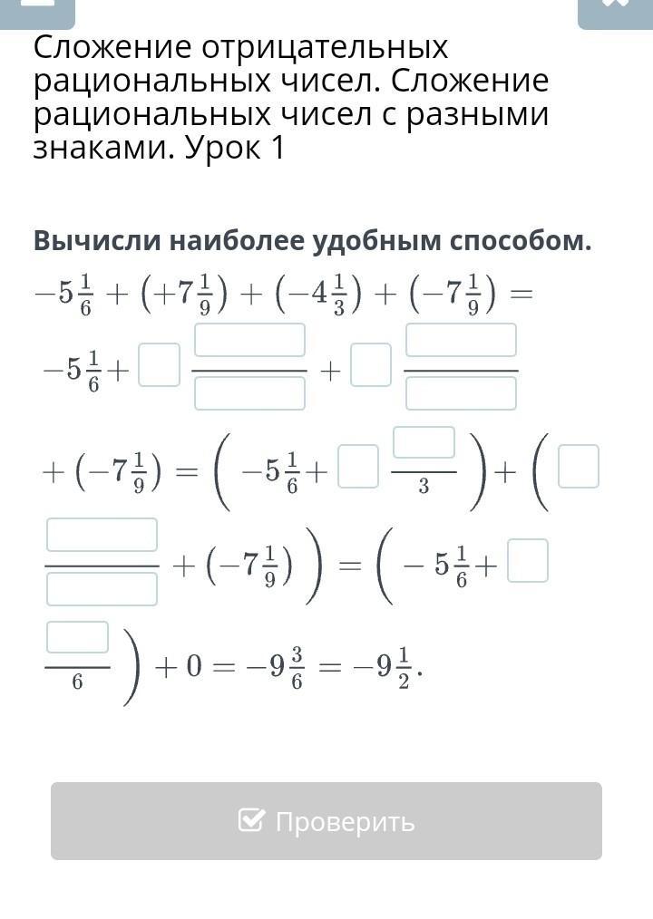 Ответ:-5 1/6+7 1/9+(-4 1/3)+(-7 1/9)=
